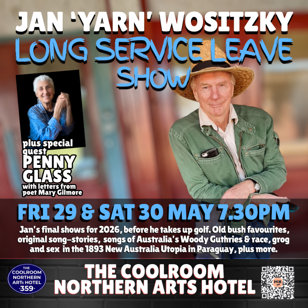 After 55 years ‘on the road’, eight books, nine albums, a dozen ABC RN feature programs, a couple of television docos and more shows than he can count, storyteller/musician Jan ‘Yarn’ Wositzky is taking long service leave (courtesy of the Australian government), and his last show for 2026 will be a hometown gig at The Coolroom, Northern Arts Hotel, Castlemaine, on Friday 29 and Saturday 30 May.